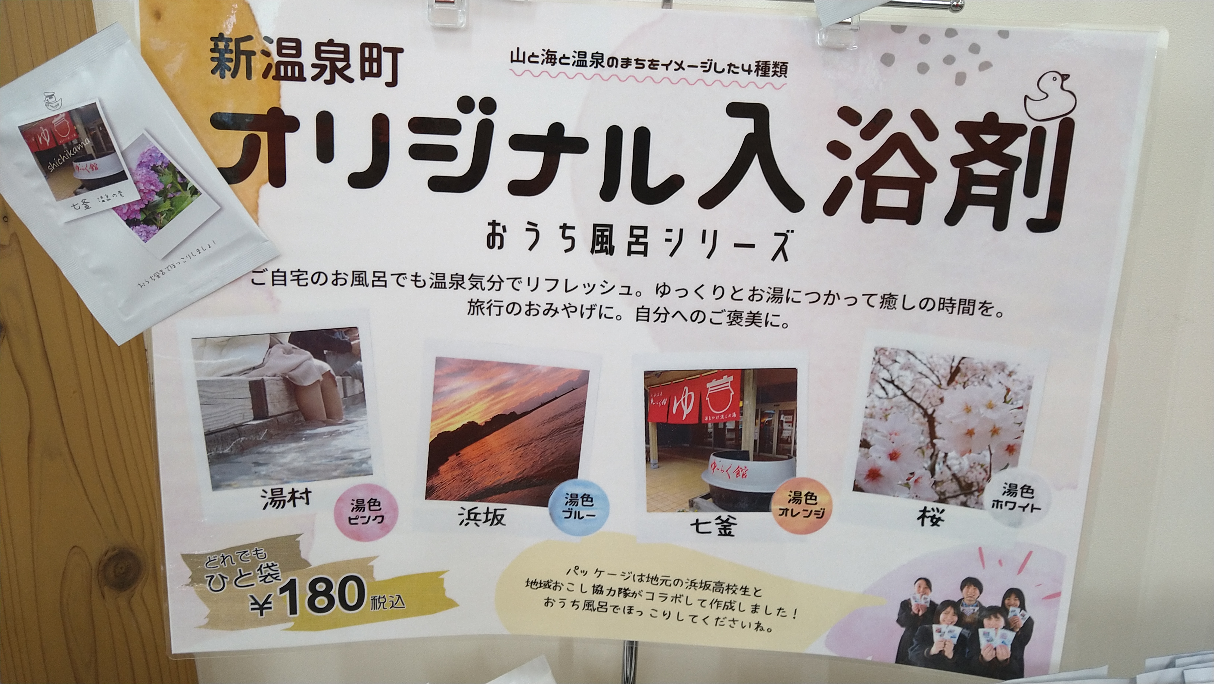 「湯村」「浜坂」「七釜」「桜」 山と海と温泉のまちをイメージした、オリジナル入浴剤4種類。 ご自宅のお風呂でも温泉気分でリフレッシュ。ゆっくりとお湯につかって癒やしの時間をお楽しみください。